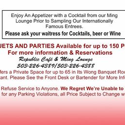 Excellent food. Fair value. Enter the Ming Lounge for an experience of your own. Find the banquet room.